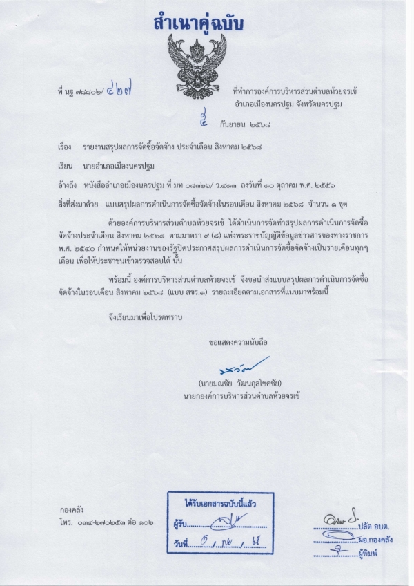 รายงานสรุปผลการจัดซื้อจัดจ้างประจำเดือนสิงหาคม 2568