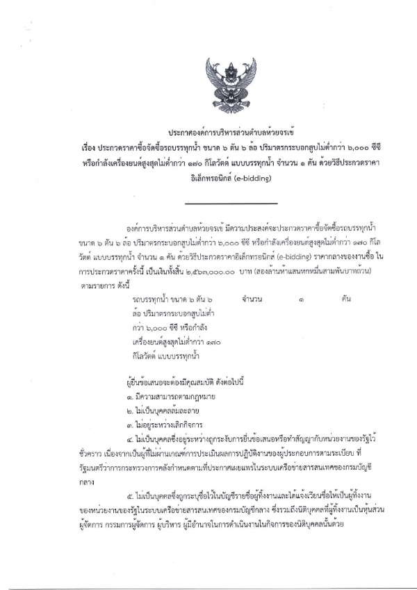 มีความประสงค์จะประกวดราคาซื้อจัดซื้อรถบรรทุกน้ำ ขนาด 6 ตัน 6 ล้อ ปริมาตรกระบอกสูบไม่ต่ำกว่า 6,000 ซีซี หรือกำลังเครื่องยนต์สูงสุดไม่ต่ำกว่า 170 กิโลวัตต์ แบบบรรทุกน้ำ จำนวน 1 คัน ด้วยวิธีประกวดราคาอิเล็กทรอนิกส์ (e-bidding) ราคากลางของงานซื้อ ในการประกวดราคาครั้งนี้ เป็นเงินทั้งสิ้น 2,563,000.00 บาท จึงประการให้ผู้ที่สนใจทราบโดยทั่วกัน รายละเอียดตามเอกสารแนบท้ายประกาศฉบับนี้