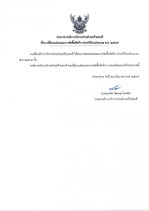 เพื่อให้การดำเนินการสอดคล้องกับปัจจุบัน องค์การบริหารส่วนตำบลห้วยจรเข้ จึงขอเปลี่ยนแปลงแผนการจัดซื้อจัดจ้าง