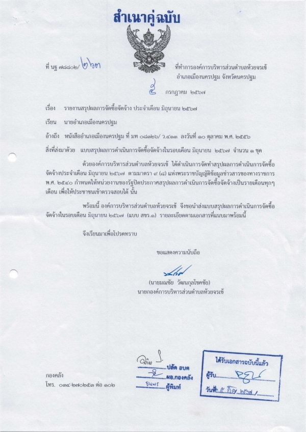รายงานสรุปผลการจัดซื้อจัดจ้างประจำเดือนมิถุนายน 2567
