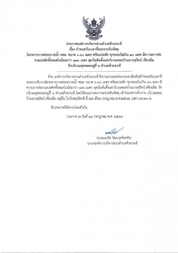 ประกาศกำหนดวันเวลาที่จะตรวจรับพัสดุ โครงการวางท่อระบายน้ำ คสล. ขนาด 0.60 เมตรพร้อมบ่อพัก ทุกระยะไม่เกิน 10 เมตร มีความยาวท่อรวมบ่อพักทั้งหมดไม่น้อยกว่า 170 เมตร จุดเริ่มต้นตั้งแต่บริเวณซอยบ้านนายสุรัตน์ เทียนอิ่ม ถึงบริเวณสุดซอยหมู่ที่6 ตำบลห้วยจรเข้