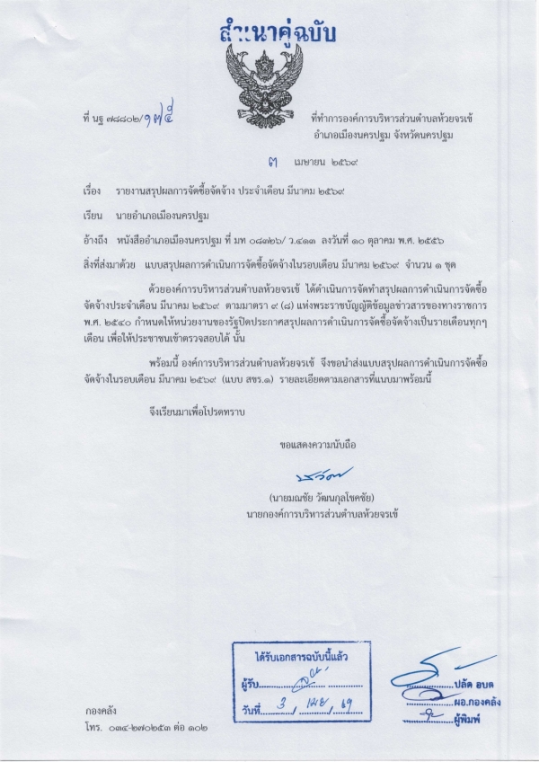 รายงานสรุปผลการจัดซื้อจัดจ้างประจำเดือนมีนาคม 2569